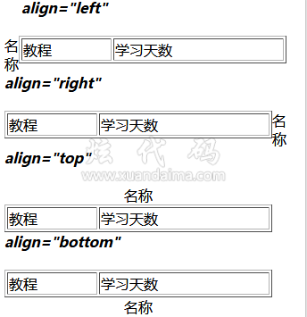 <i><b>align="left"</b></i></br></br> <table border="1" width="300"> <caption align="left">名称</caption> <tr> <td>教程</td> <td>学习天数</td> </tr> </table> <i><b>align="right"</b></i></br></br> <table border="1" width="300"> <caption align="right">名称</caption> <tr> <td>教程</td> <td>学习天数</td> </tr> </table> <i><b>align="top"</b></i></br></br> <table border="1" width="300"> <caption align="top">名称</caption> <tr> <td>教程</td> <td>学习天数</td> </tr> </table> <i><b>align="bottom"</b></i></br></br> <table border="1" width="300"> <caption align="bottom">名称</caption> <tr> <td>教程</td> <td>学习天数</td> </tr> </table>